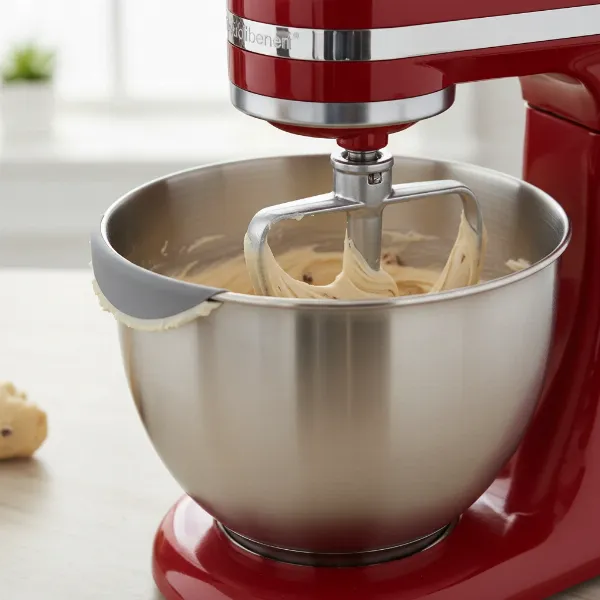 • Double-sided scraper beater: This innovative attachment, with its flexible edges, continuously wipes the sides and bottom of the bowl as it mixes, dramatically reducing mixing time and eliminating the need for manual scraping.